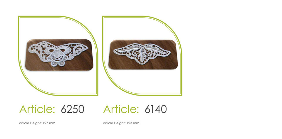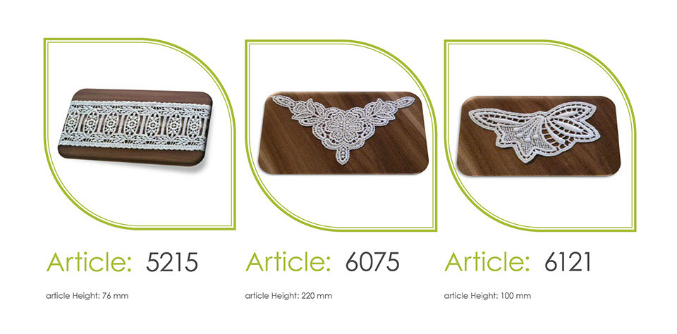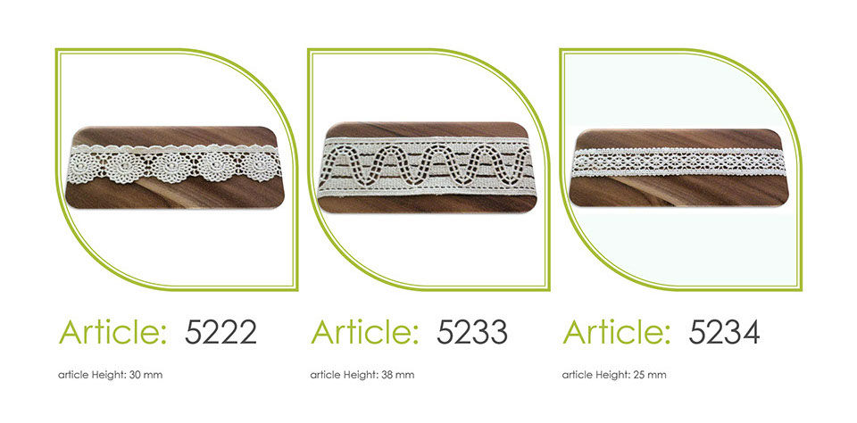 ORGANICLACE We are proud to introduce Organiclace line specially designed for underwear and garments. Our new line of organiclace is made from 100% certified organic cotton. Is especially environmentally friendly, non-toxic manufacturing technology, from start to finish of making organiclace. These organiclace are sure to add beauty and style to your products, not only for organic buyers, but mainstream buyers as well. Our manufacture is famous for that it offers the customer the highest quality of organiclace. With over 25 years of experience in the production of lace, we are able to create not only the best Macrame lace, used for curtains and upholstery, but also organiclace for garments. These laces extend the life of your garments after every wash.